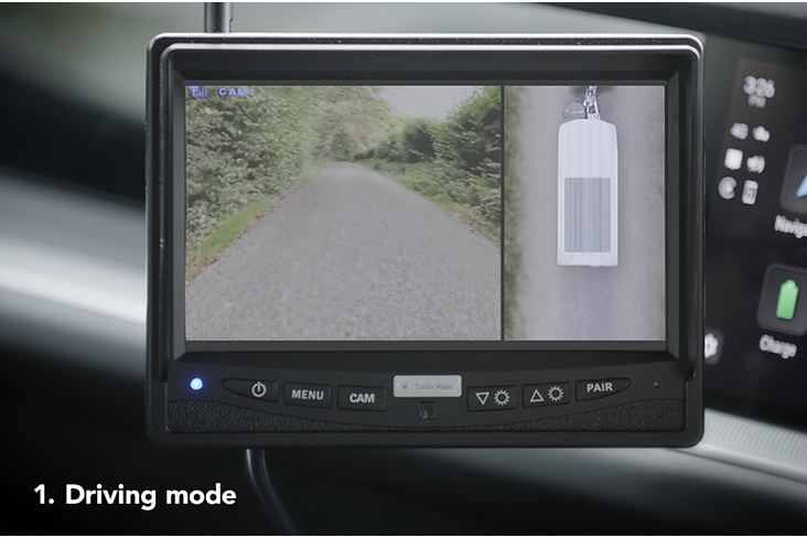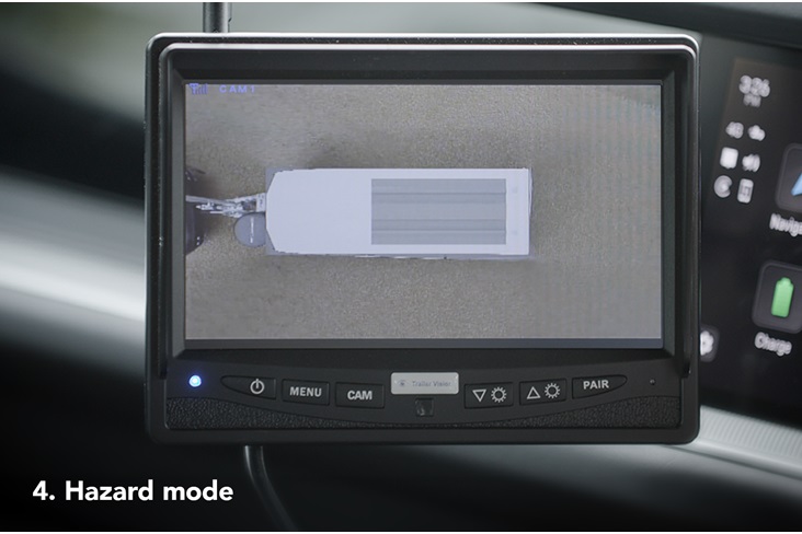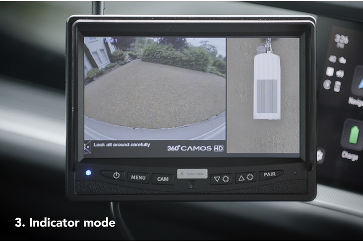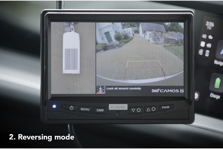 Négy kamera biztosít 360°-os látást a teljes körű kilátás és biztonságos manőverezés érdekében. A vontató járműben vezeték nélkül csatlakoztatott monitor segítségével a képernyő a irányjelző pozíciója alapján tud váltani a nézetek között.